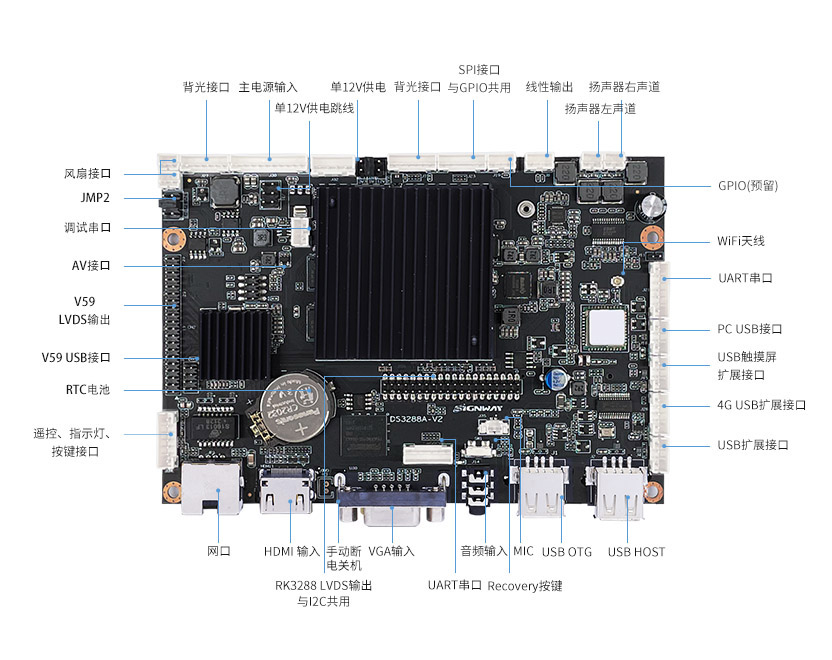 注:USB默認HOST,其中一路Type-A支持OTG,一路PH2.0和4G模塊共用 ,一路觸摸框切換